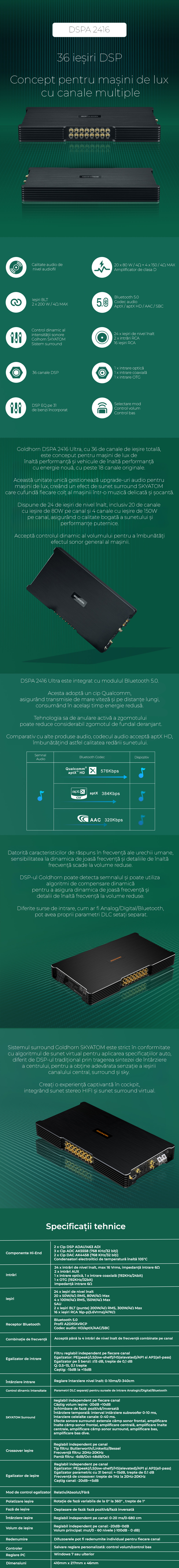 Amplificator cu DSP auto Goldhorn DSPA 2416 ULTRA 36 canale 2200 Watts max BT OTG Coaxial Optic